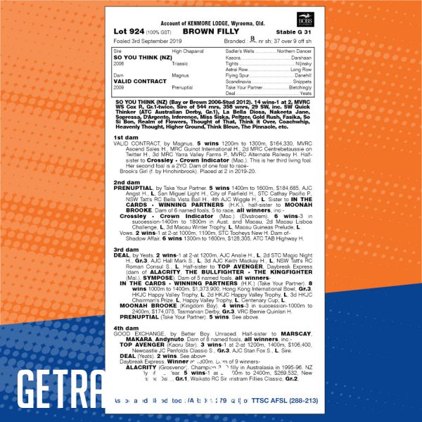1st dam VALID CONTRACT, by Magnus. 5 wins to 1300m, A$164,330, MVRC Ascend Sales H., MRC Guinot International H., 2d MRC (Mornington) Centrebetaussie on Twitter H., 3d MRC Yarra Valley Farms P., MVRC Alternate Railway H. Half-sister to Crossley - Crown Indicator (Mac.). This is her third living foal. Her second foal is a 2YO. Dam of 1 foal to race- Brook's Girl